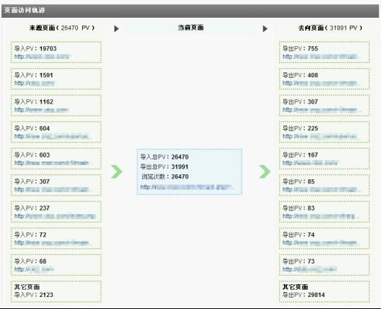 訪客經(jīng)常在網(wǎng)站中的各個頁面之間跳轉(zhuǎn),訪問的路徑不勝枚舉,但可以通過觀察焦點頁面及其上下游頁面,掌握訪客的來路和去向,發(fā)現(xiàn)較普遍的訪客訪問習(xí)慣。頁面訪問軌跡即用來完成該功能,用戶可自由指定觀察焦點頁面,系統(tǒng)會列出該頁面的前十位來路頁面和去向頁面。對觀察焦點頁面而言,其自身的導(dǎo)入、導(dǎo)出PV的多少能夠反映出該頁面在網(wǎng)站的權(quán)重地位,而通過觀察來源和去向頁面又能最大限度的了解到訪客的行為習(xí)慣及興趣點。