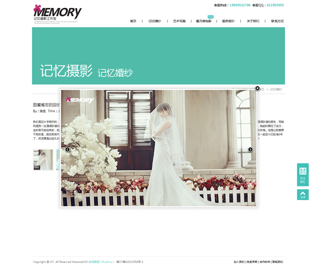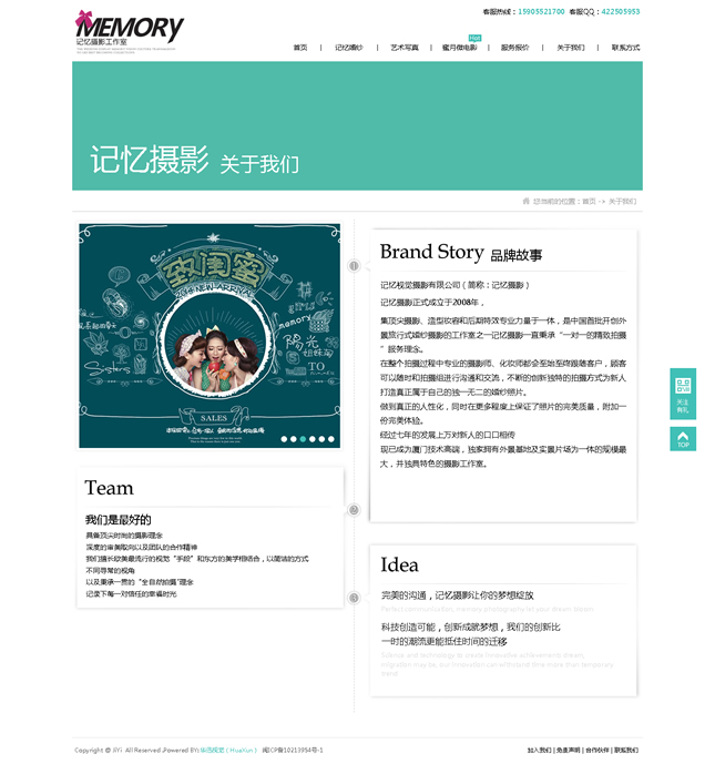 記憶視覺攝影有限公司(簡(jiǎn)稱:記憶攝影)記憶攝影正式成立于2008年,集頂尖攝影、造型妝容和后期特效專業(yè)力量于一體,是中國(guó)首批開創(chuàng)外景旅行式婚紗攝影的工作室之一記憶攝影一直秉承“一對(duì)一的精致拍攝”服務(wù)理念。在整個(gè)拍攝過程中專業(yè)的攝影師、化妝師都會(huì)至始至終跟隨客戶,顧客可以隨時(shí)和拍攝組進(jìn)行溝通和交流,不斷的創(chuàng)新獨(dú)特的拍攝方式為新人打造真正屬于自己的獨(dú)一無(wú)二的婚紗照片。做到真正的人性化,同時(shí)在更多程度上保證了照片的完美質(zhì)量,附加一份完美體驗(yàn)。